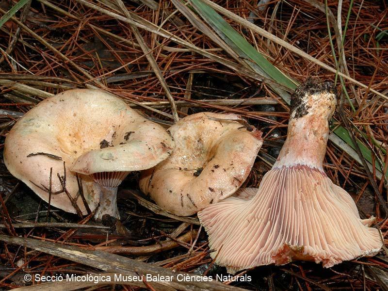 Descripció : L'esclata-sang Lactarius sanguifluus (Paulet) Fr., fong de la família dels russulals, és un dels més populars, apreciats, cercats i consumits arreu dels Països Catalans. Creix a zona de pinar ja que guarda una estreta relació amb el pi blanc (Pinus halepensis) amb el que forma micorrizes, que són associacions simbiòntiques que es formen entre el fong i les arrels de l'arbre, amb la finalitat d'afavorir el desenvolupament d'ambdues espècies. El esporòfor d'aquest fong es veu sovint atacat per Hypomyces lateritius (Fr.) Tul, un fong paràsit que li provoca la deformació de les làmines i una consistència més compacta de la carn. L'esclata-sang parasitat no deixa de ser comestible i es coneix a Mallorca com a 'esclata-sang de tot l'any' o 'esclata-sang hivernenc'.